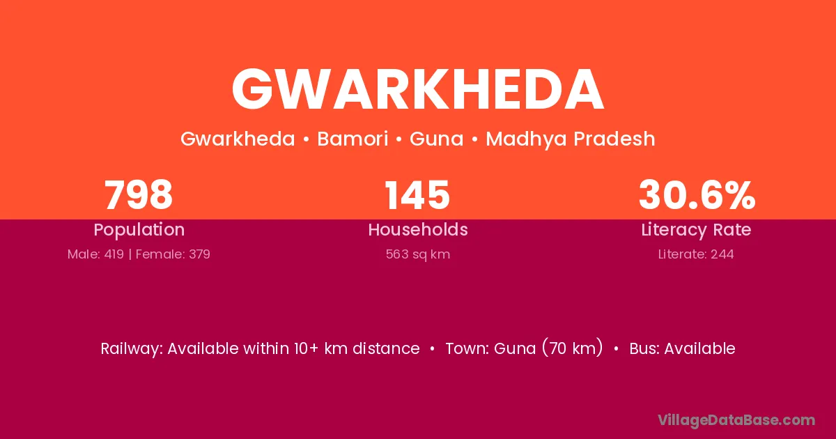 Gwarkheda village has a total population of 798 people, of which 419 are males and 379 are females.