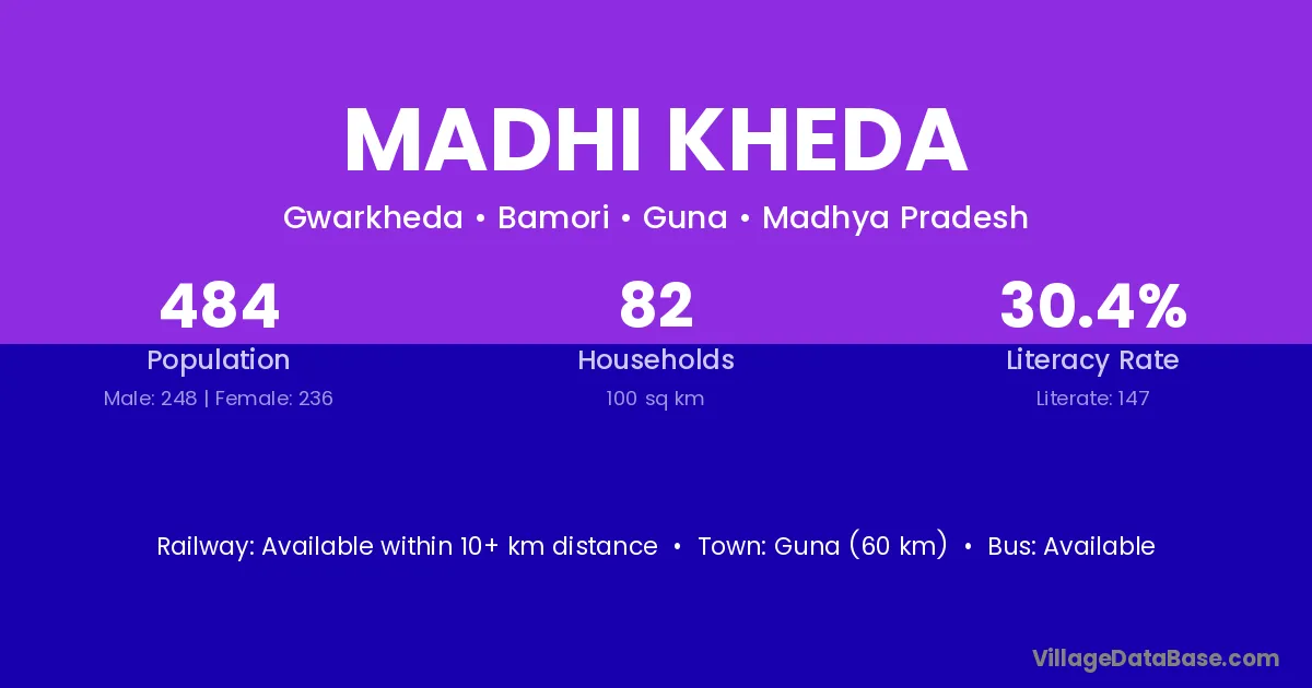 Guna (60 km) is the nearest town to Madhi Kheda village for major economic activities and is located approximately 60 km away.