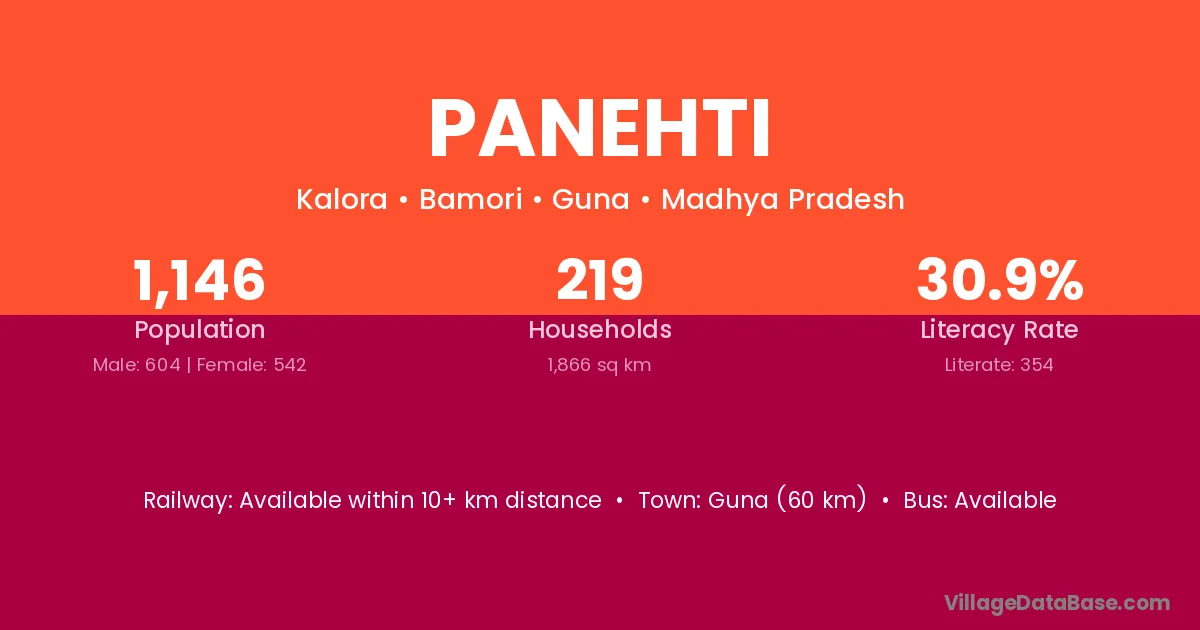 Guna (60 km) is the nearest town to Panehti village for major economic activities and is located approximately 60 km away.