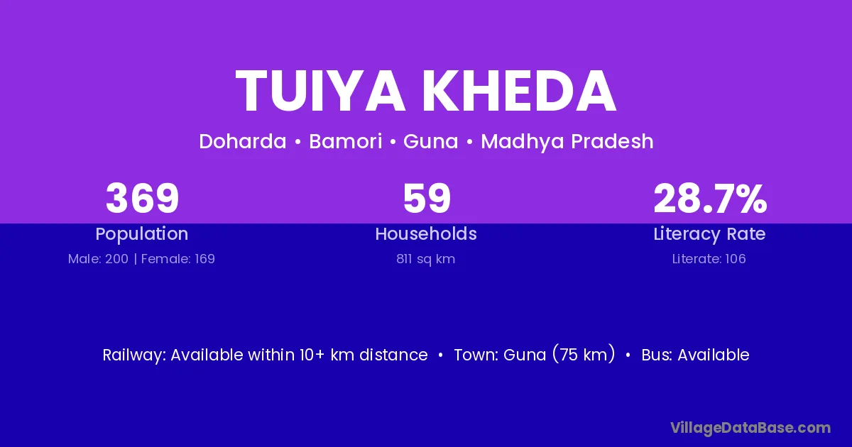 Guna (75 km) is the nearest town to Tuiya Kheda village for major economic activities and is located approximately 75 km away.