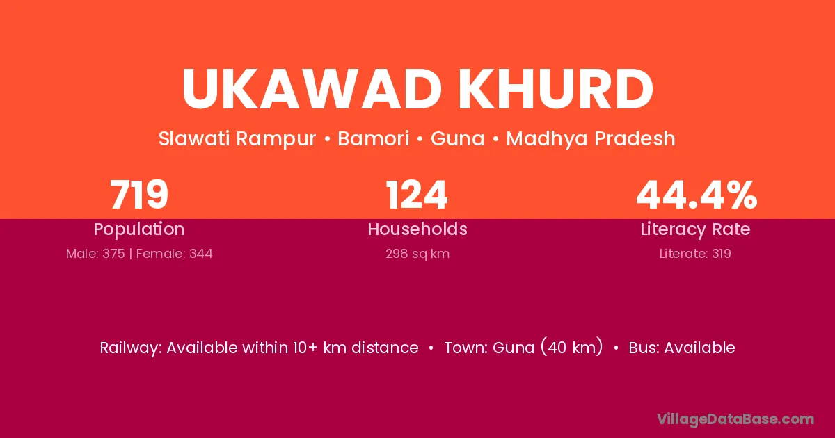 Guna (40 km) is the nearest town to Ukawad Khurd village for major economic activities and is located approximately 40 km away.