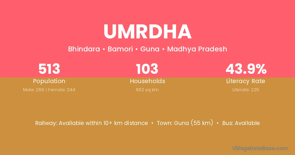 Guna (55 km) is the nearest town to Umrdha village for major economic activities and is located approximately 55 km away.