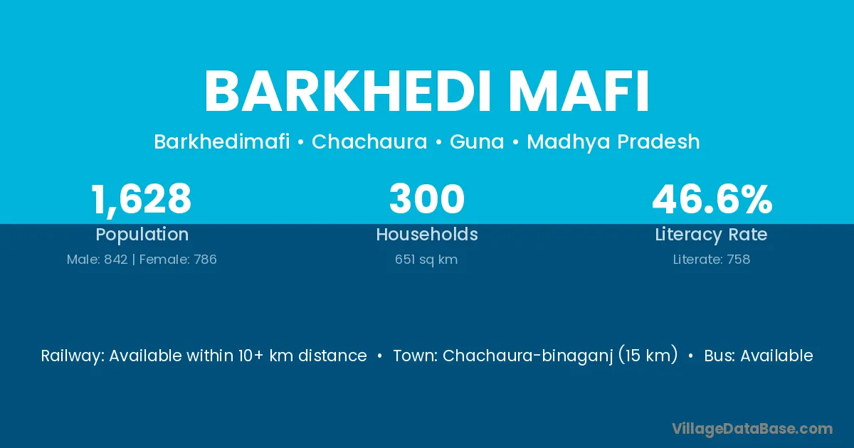 Barkhedi Mafi village has a total population of 1,628 people, of which 842 are males and 786 are females.