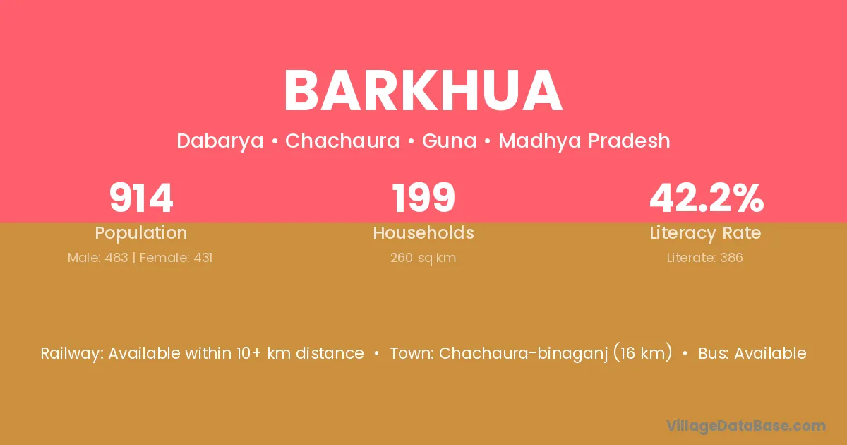 Barkhua village has a total population of 914 people, of which 483 are males and 431 are females.