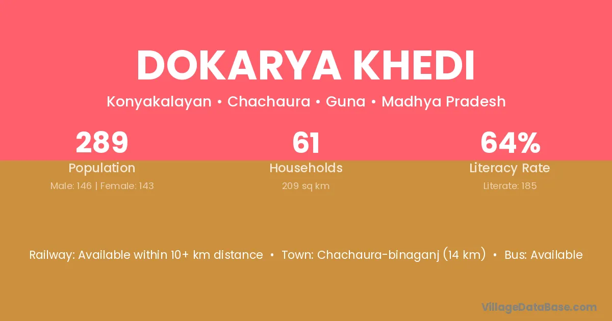 Dokarya Khedi village has a total population of 289 people, of which 146 are males and 143 are females.
