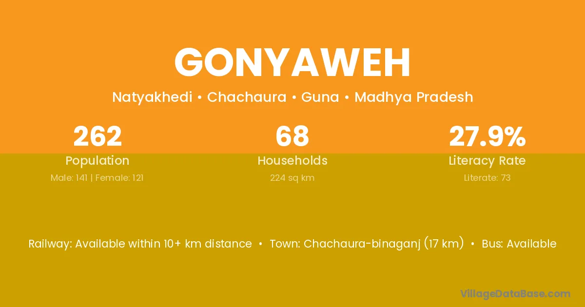 Chachaura-binaganj (17 km) is the nearest town to Gonyaweh village for major economic activities and is located approximately 17 km away.