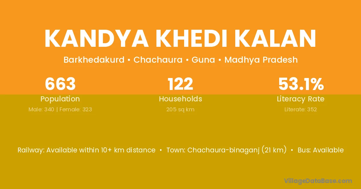 Kandya Khedi Kalan village has a total population of 663 people, of which 340 are males and 323 are females.