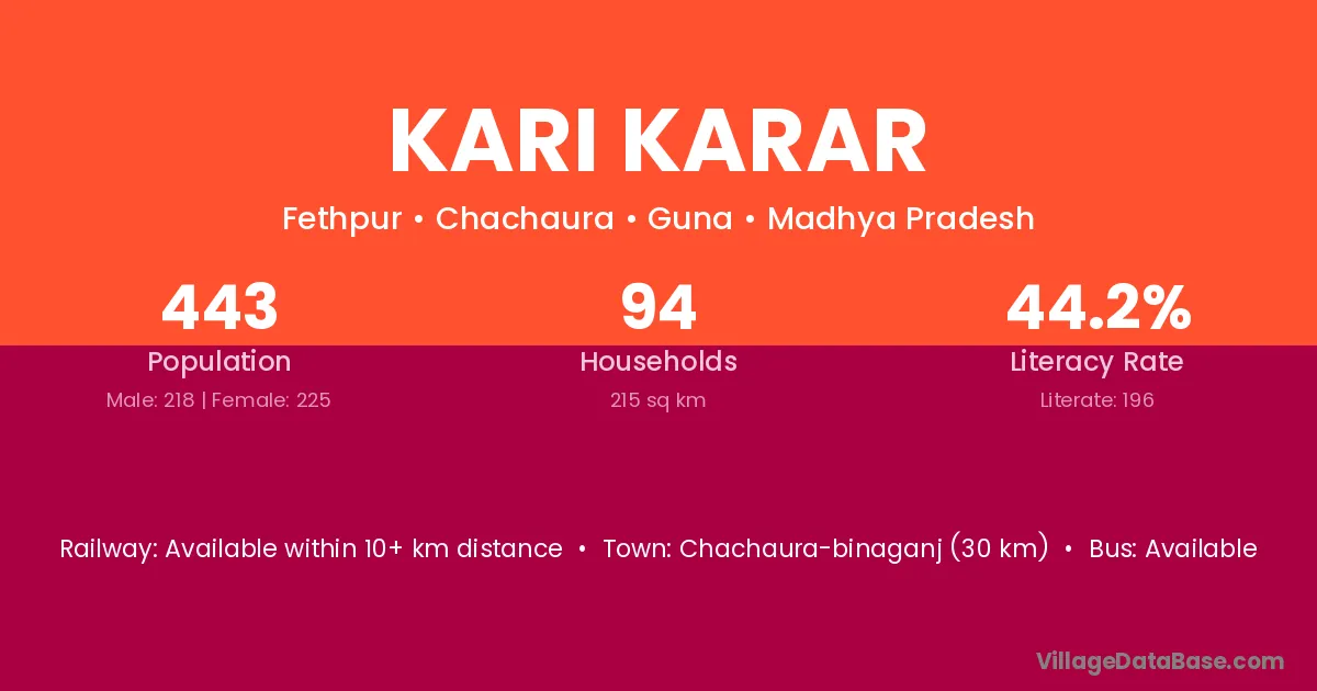 Kari Karar village has a total population of 443 people, of which 218 are males and 225 are females.