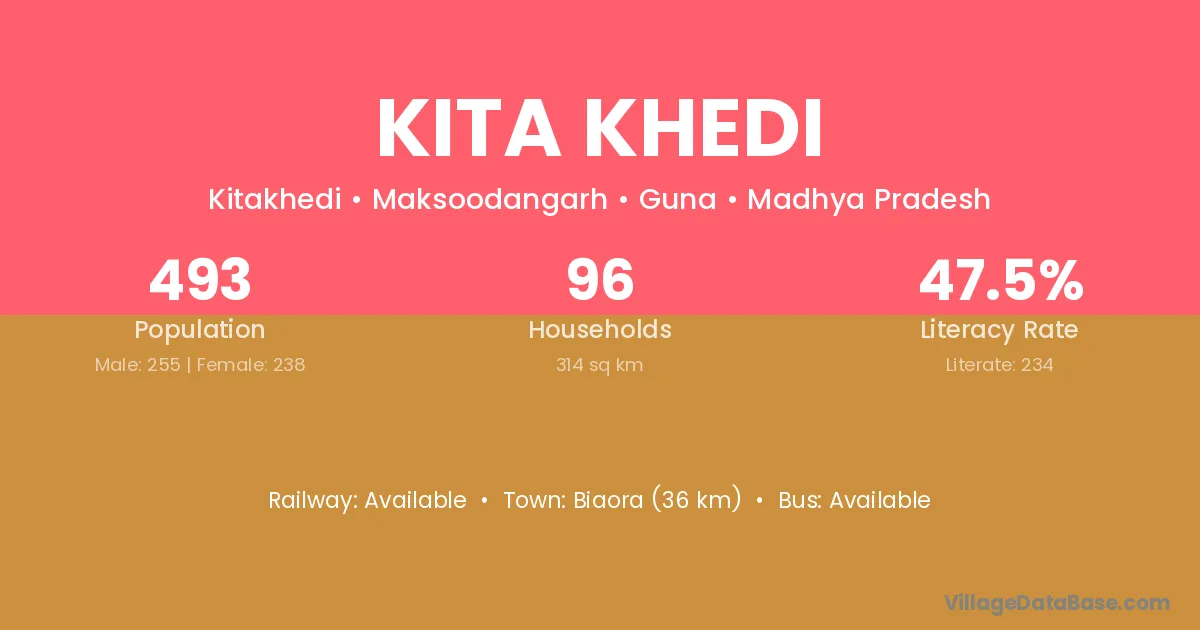 The literacy rate of Kita Khedi village is 59.26%. Male literacy stands at 70.35% and female literacy at 47.01%.