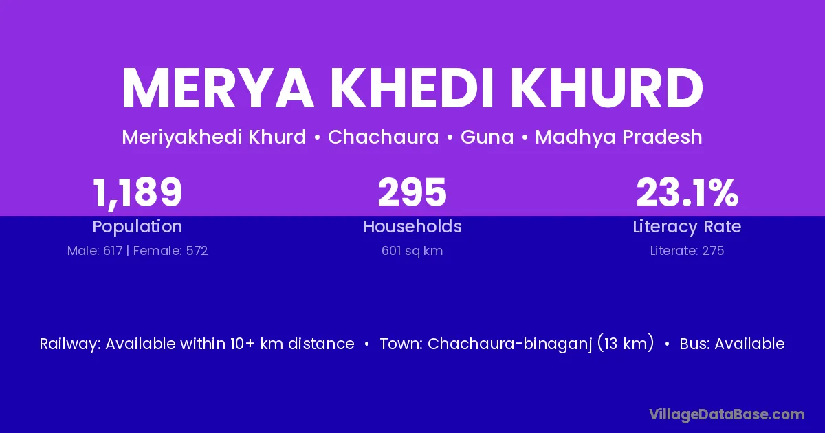 Merya Khedi Khurd village has a total population of 1,189 people, of which 617 are males and 572 are females.