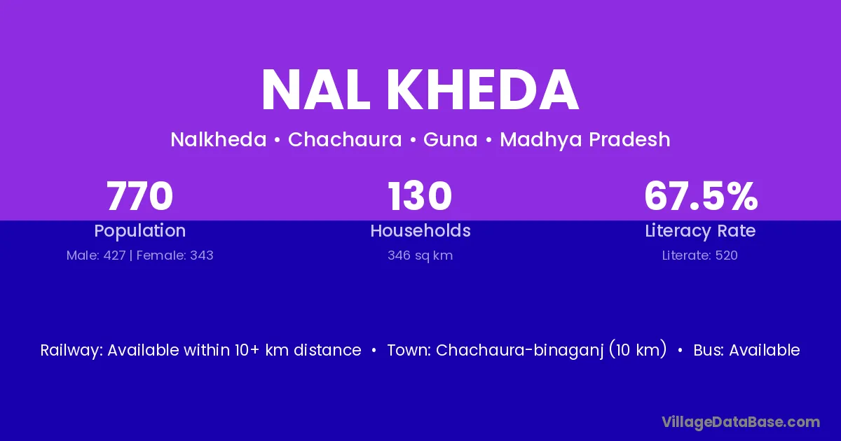 Nal Kheda village has a total population of 770 people, of which 427 are males and 343 are females.