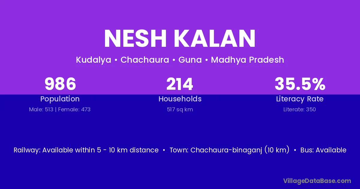 Chachaura-binaganj (10 km) is the nearest town to Nesh Kalan village for major economic activities and is located approximately 10 km away.