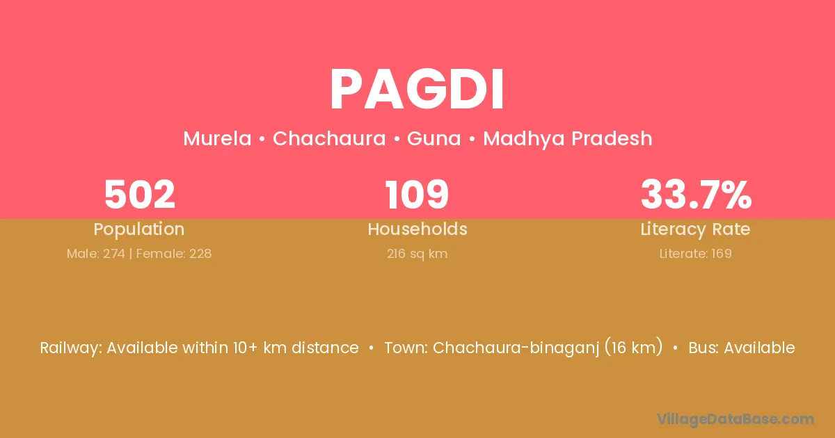 Chachaura-binaganj (16 km) is the nearest town to Pagdi village for major economic activities and is located approximately 16 km away.