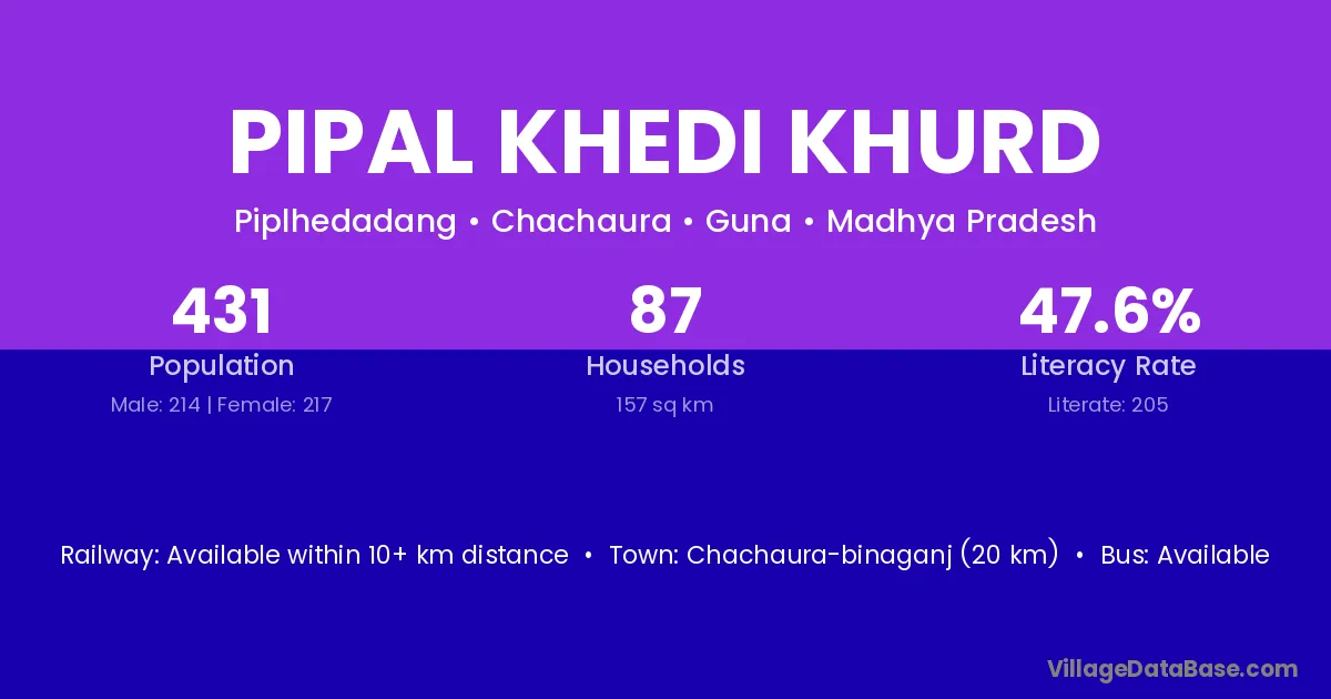 Pipal Khedi Khurd village has a total population of 431 people, of which 214 are males and 217 are females.