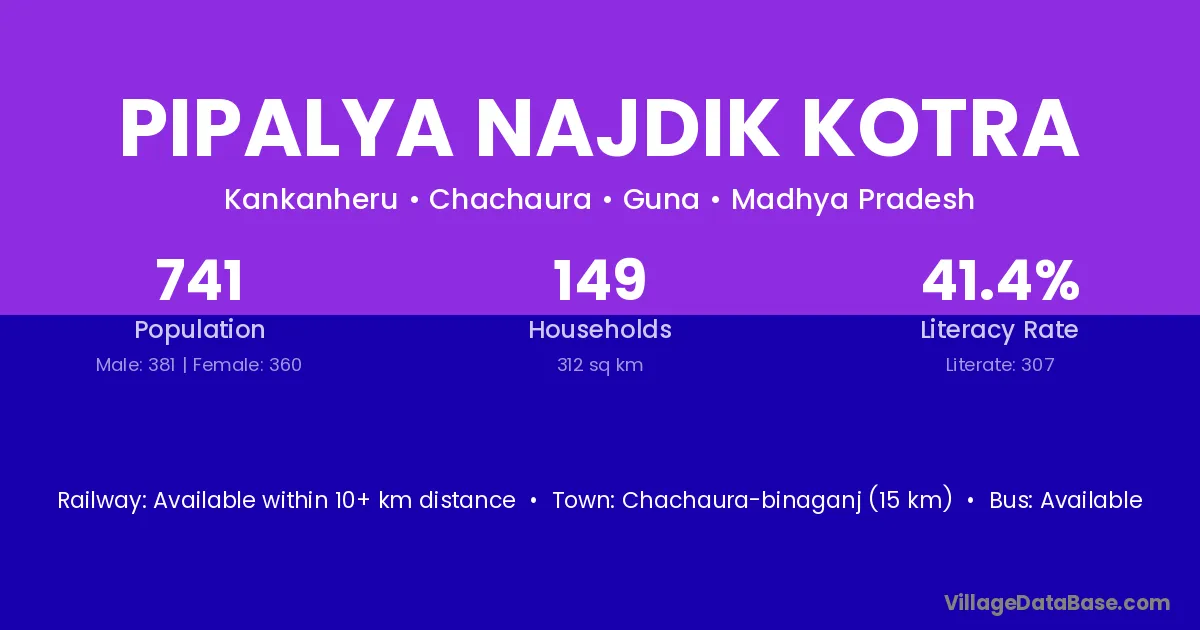 Pipalya Najdik Kotra village has a total population of 741 people, of which 381 are males and 360 are females.