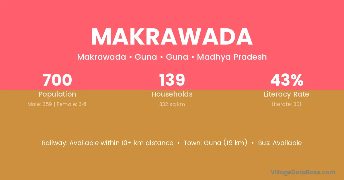 Guna (19 km) is the nearest town to Makrawada village for major economic activities and is located approximately 19 km away.