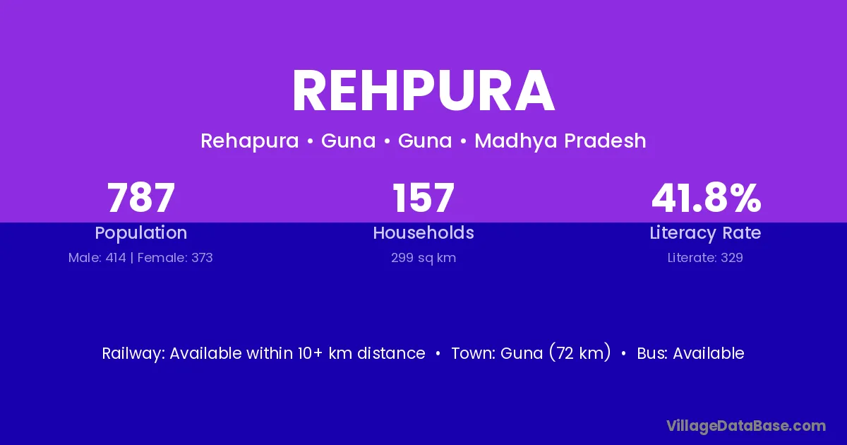 Guna (72 km) is the nearest town to Rehpura village for major economic activities and is located approximately 72 km away.