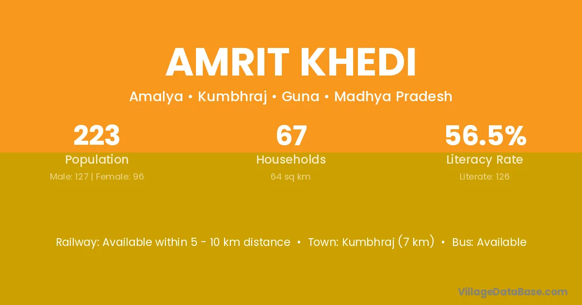 Kumbhraj (7 km) is the nearest town to Amrit Khedi village for major economic activities and is located approximately 7 km away.