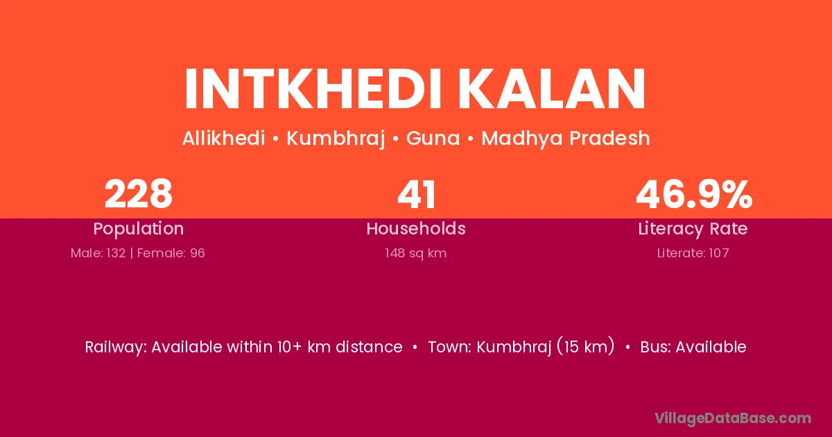 Intkhedi Kalan village has a total population of 228 people, of which 132 are males and 96 are females.