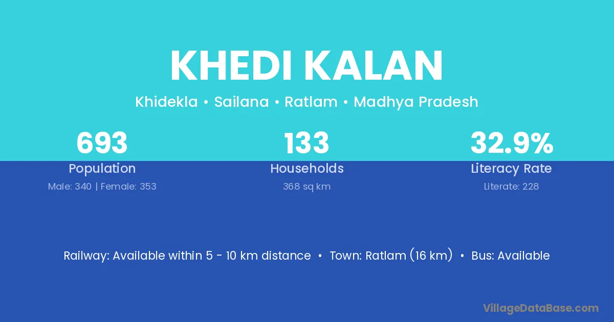 The literacy rate of Khedi Kalan village is 35.14%. Male literacy stands at 42.94% and female literacy at 26.71%.