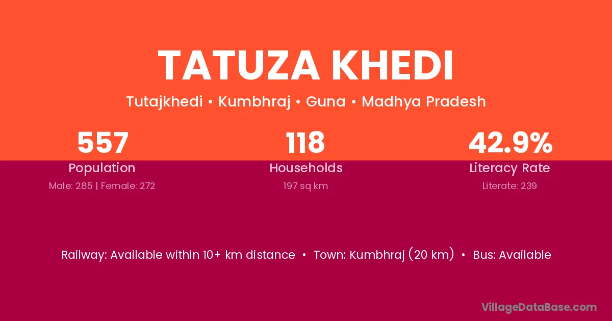 Tatuza Khedi village has a total population of 557 people, of which 285 are males and 272 are females.