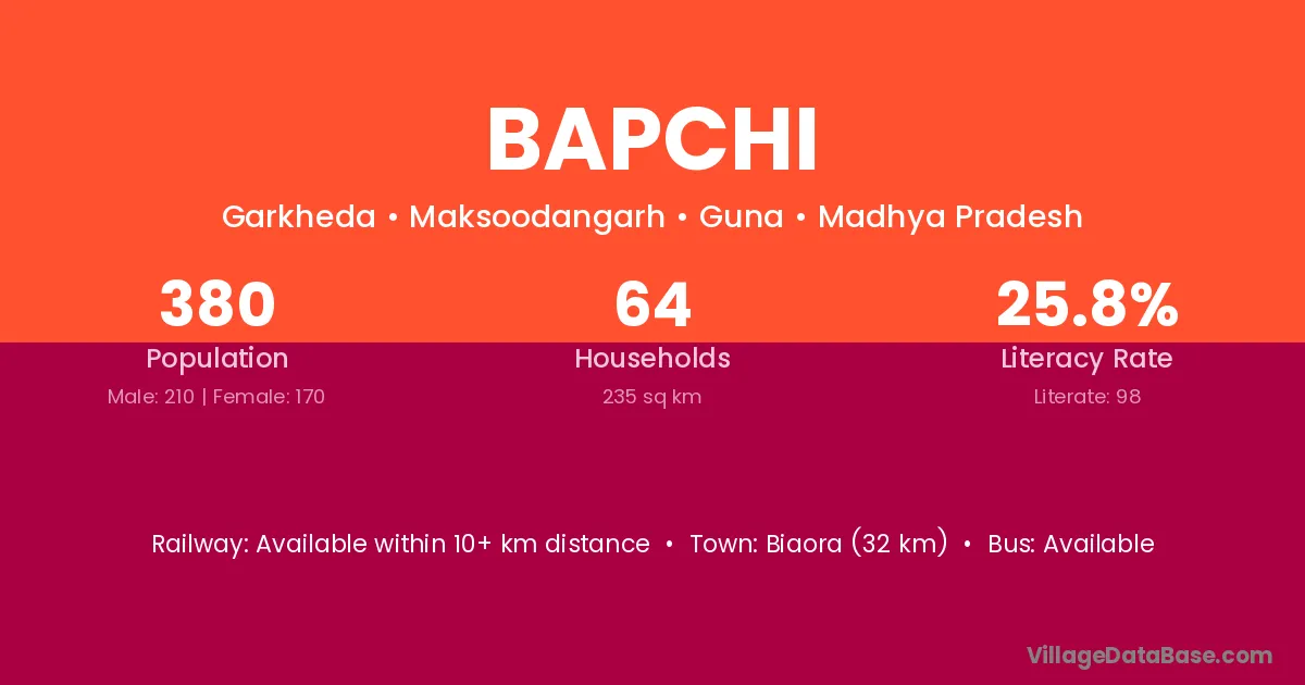 Bapchi village has a total population of 380 people, of which 210 are males and 170 are females.