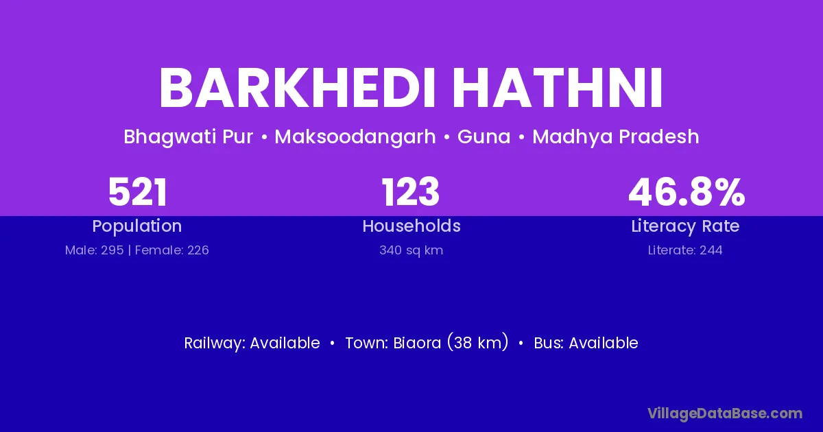 Barkhedi Hathni village has a total population of 521 people, of which 295 are males and 226 are females.