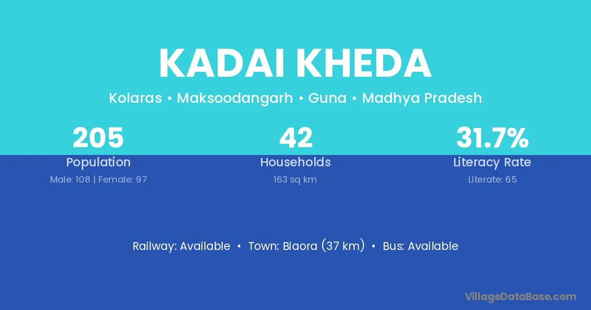 Biaora (37 km) is the nearest town to Kadai Kheda village for major economic activities and is located approximately 37 km away.