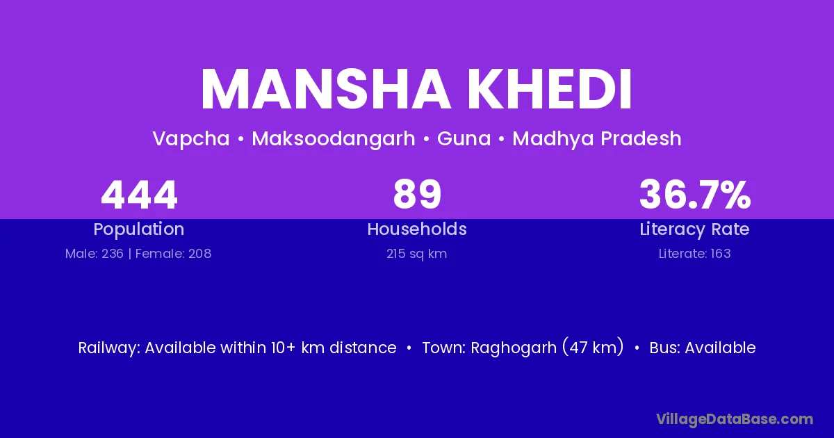 Raghogarh (47 km) is the nearest town to Mansha Khedi village for major economic activities and is located approximately 47 km away.
