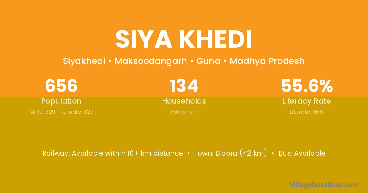 Siya Khedi village has a total population of 656 people, of which 329 are males and 327 are females.