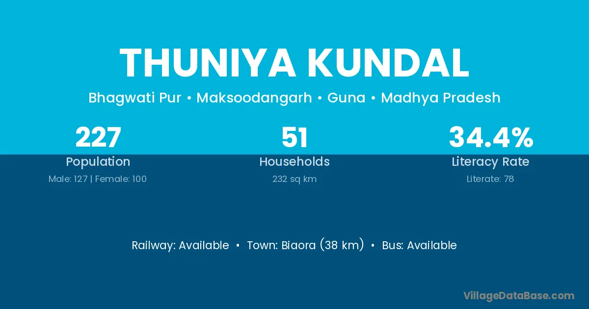 Biaora (38 km) is the nearest town to Thuniya Kundal village for major economic activities and is located approximately 38 km away.