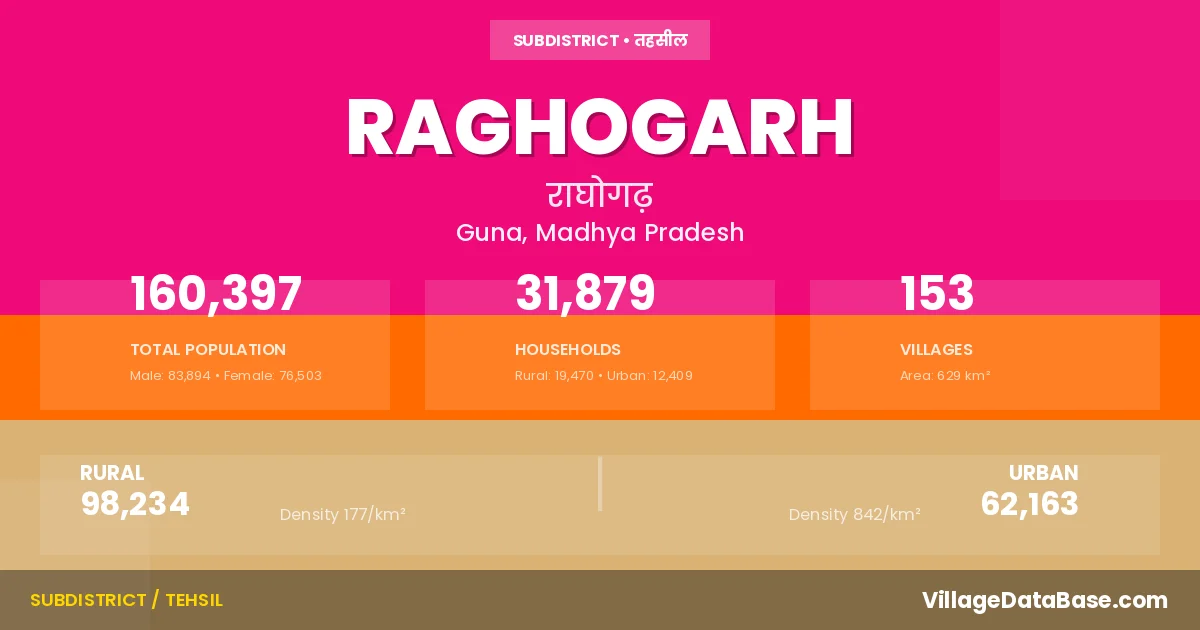 According to the 2011 census The total area of Raghogarh Tehsil is 629 km², with a population of 160397 people. The population density is 255 inhabitants per square kilometre, and there are approximately 31879 houses in the sub district.