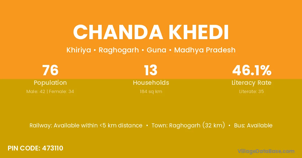Raghogarh (32 km) is the nearest town to Chanda Khedi village for major economic activities and is located approximately 32 km away.