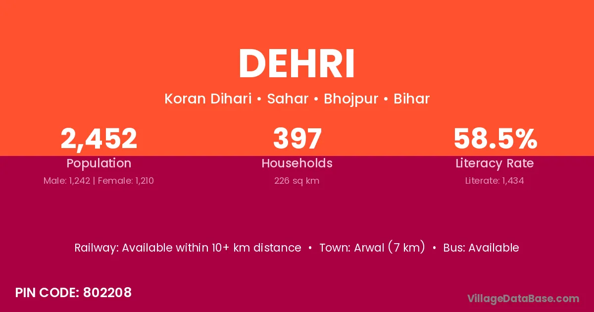 The literacy rate of Dehri village is 31.13%. Male literacy stands at 39.12% and female literacy at 21.22%.