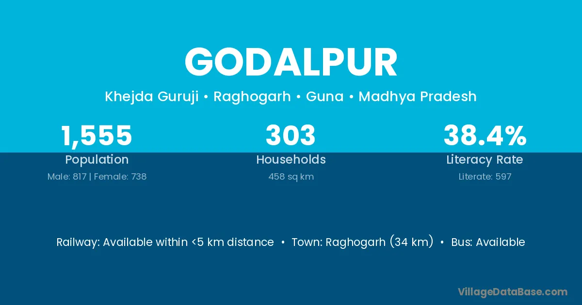 Raghogarh (34 km) is the nearest town to Godalpur village for major economic activities and is located approximately 34 km away.