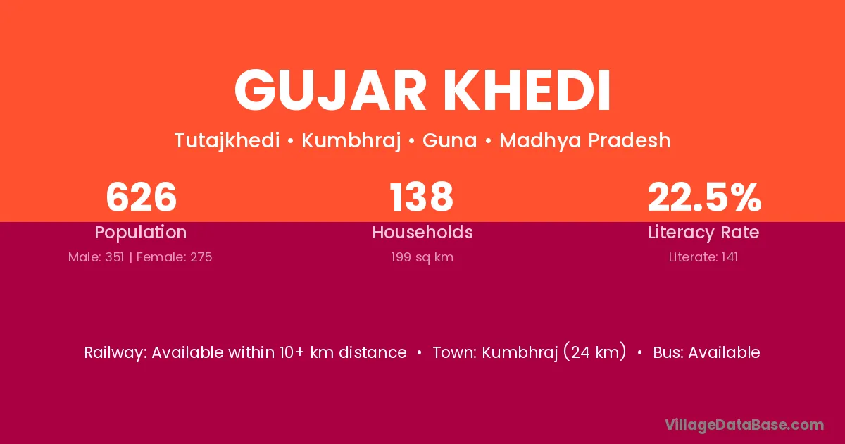 Raghogarh (14 km) is the nearest town to Gujar Khedi village for major economic activities and is located approximately 14 km away.