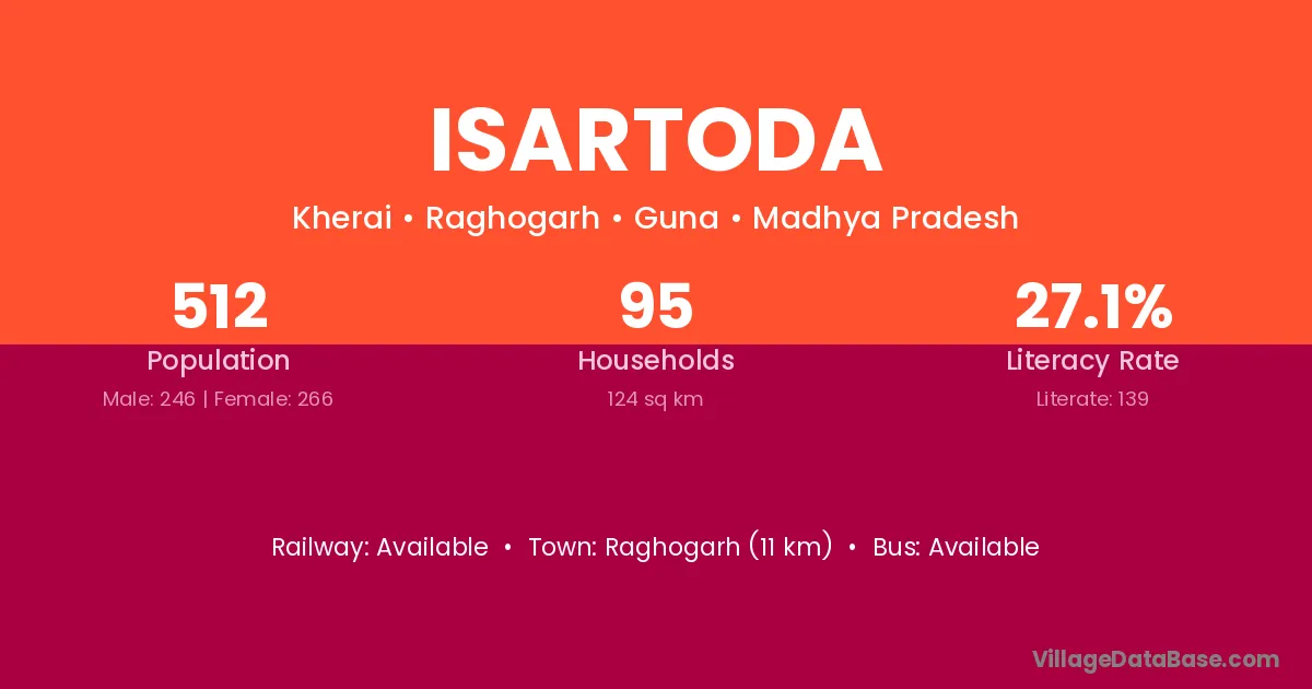 Raghogarh (11 km) is the nearest town to Isartoda village for major economic activities and is located approximately 11 km away.