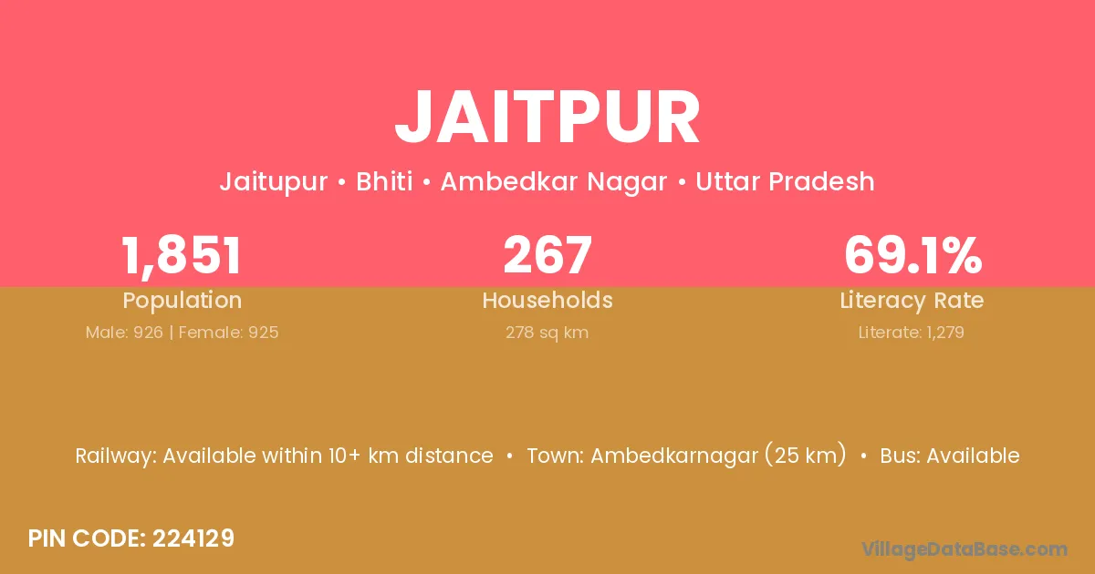 Jaitpur village has a total population of 431 people, of which 222 are males and 209 are females.