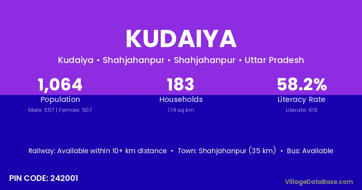 Raghogarh (20 km) is the nearest town to Kudaiya village for major economic activities and is located approximately 20 km away.