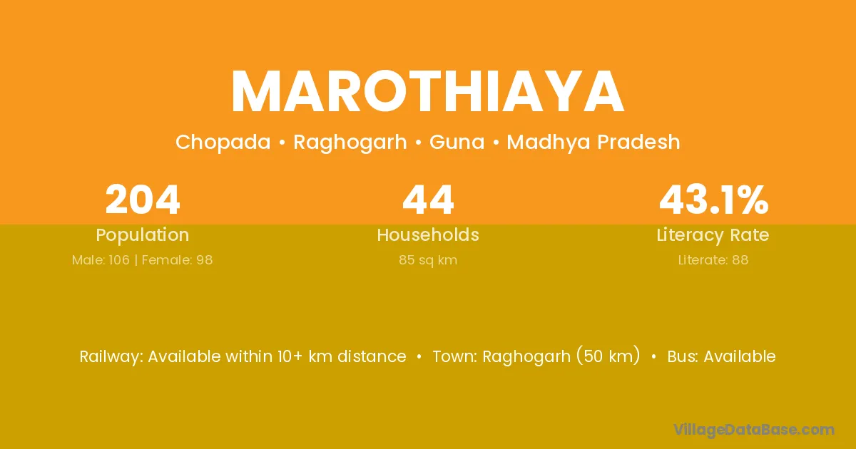 Raghogarh (50 km) is the nearest town to Marothiaya village for major economic activities and is located approximately 50 km away.