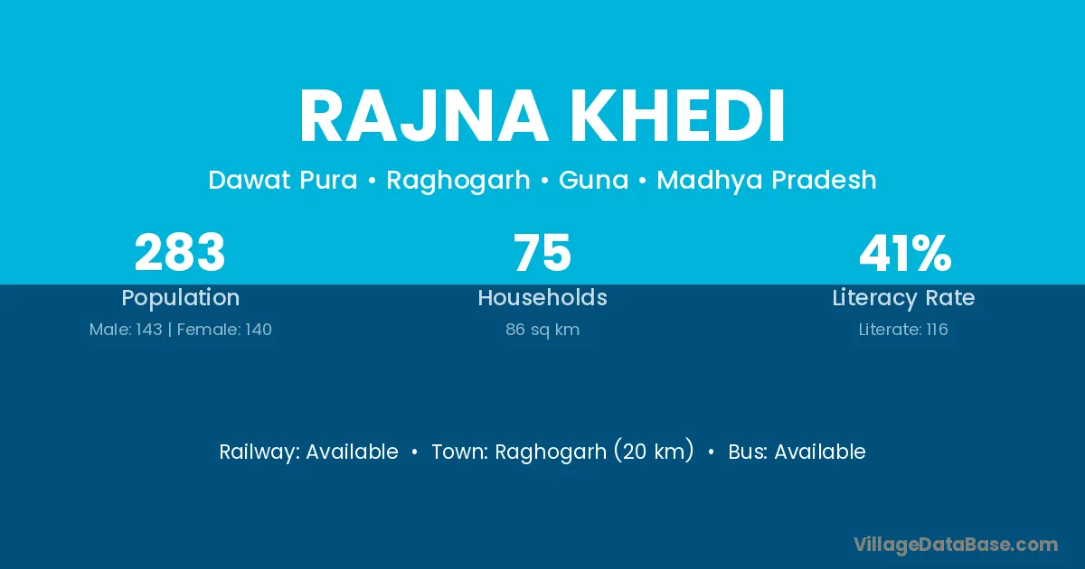 Raghogarh (20 km) is the nearest town to Rajna Khedi village for major economic activities and is located approximately 20 km away.