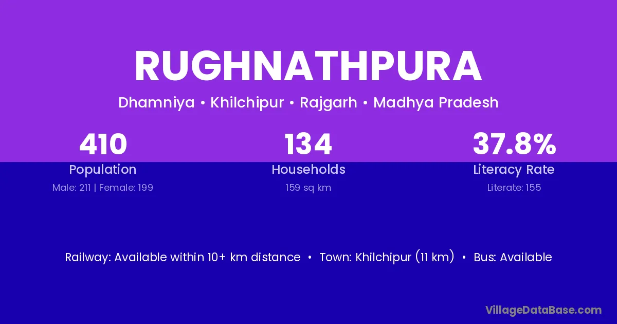 Raghogarh (7 km) is the nearest town to Rughnathpura village for major economic activities and is located approximately 7 km away.