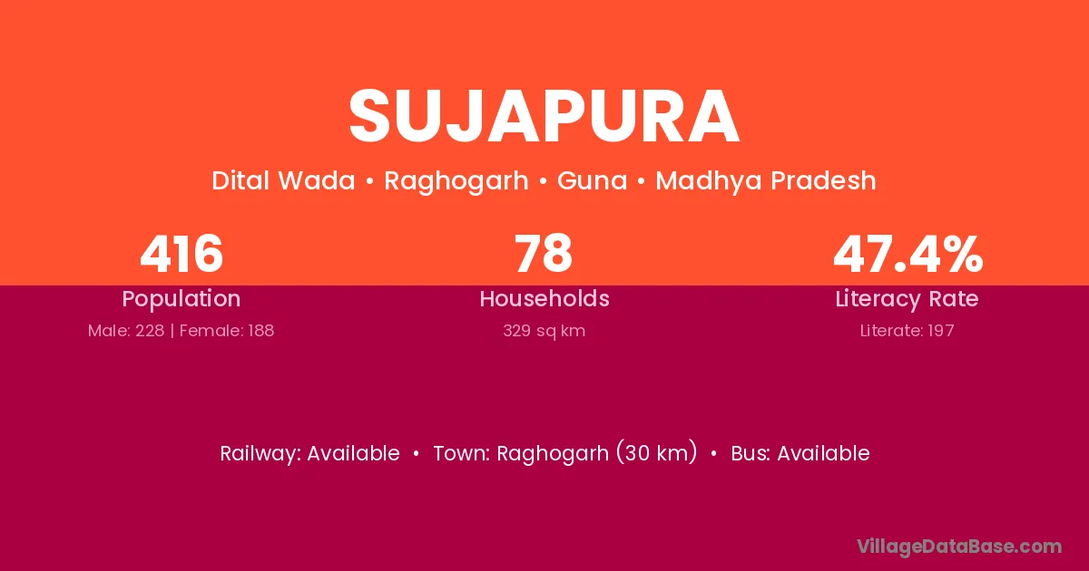 Raghogarh (30 km) is the nearest town to Sujapura village for major economic activities and is located approximately 30 km away.