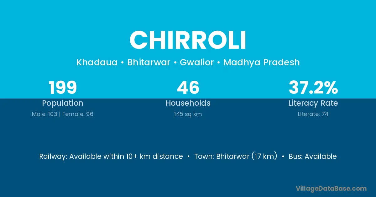Bhitarwar (17 km) is the nearest town to Chirroli village for major economic activities and is located approximately 17 km away.