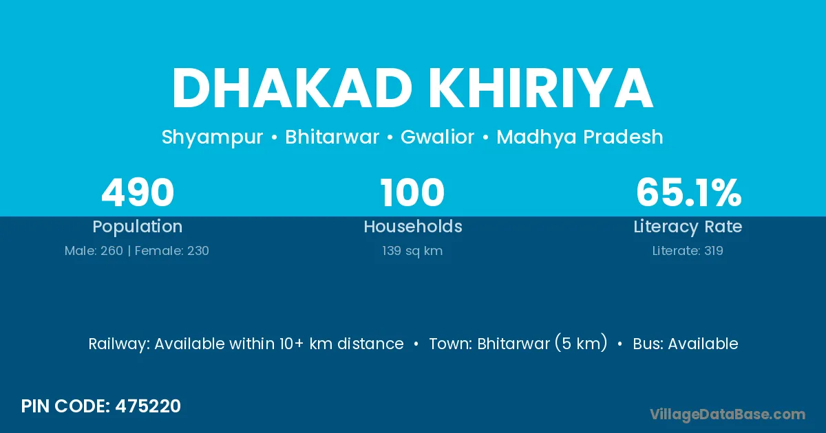 Bhitarwar (5 km) is the nearest town to Dhakad Khiriya village for major economic activities and is located approximately 5 km away.
