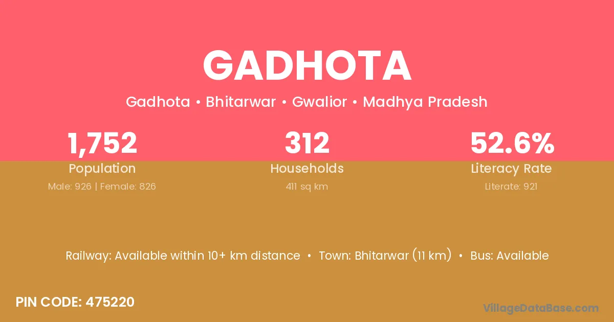 Bhitarwar (11 km) is the nearest town to Gadhota village for major economic activities and is located approximately 11 km away.