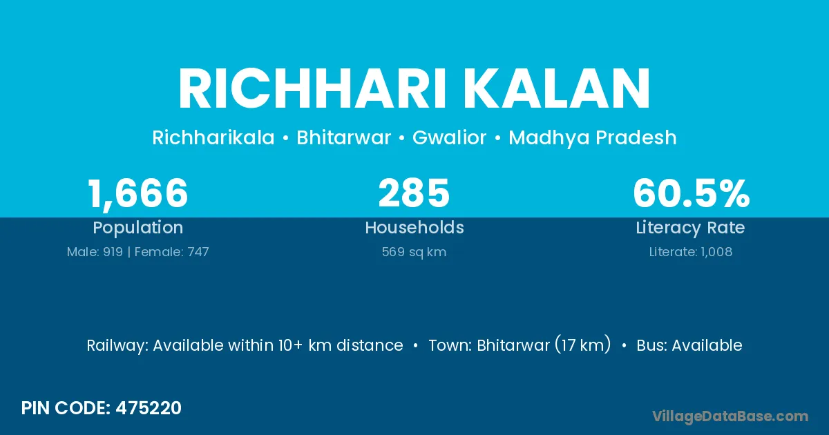 Bhitarwar (17 km) is the nearest town to Richhari Kalan village for major economic activities and is located approximately 17 km away.