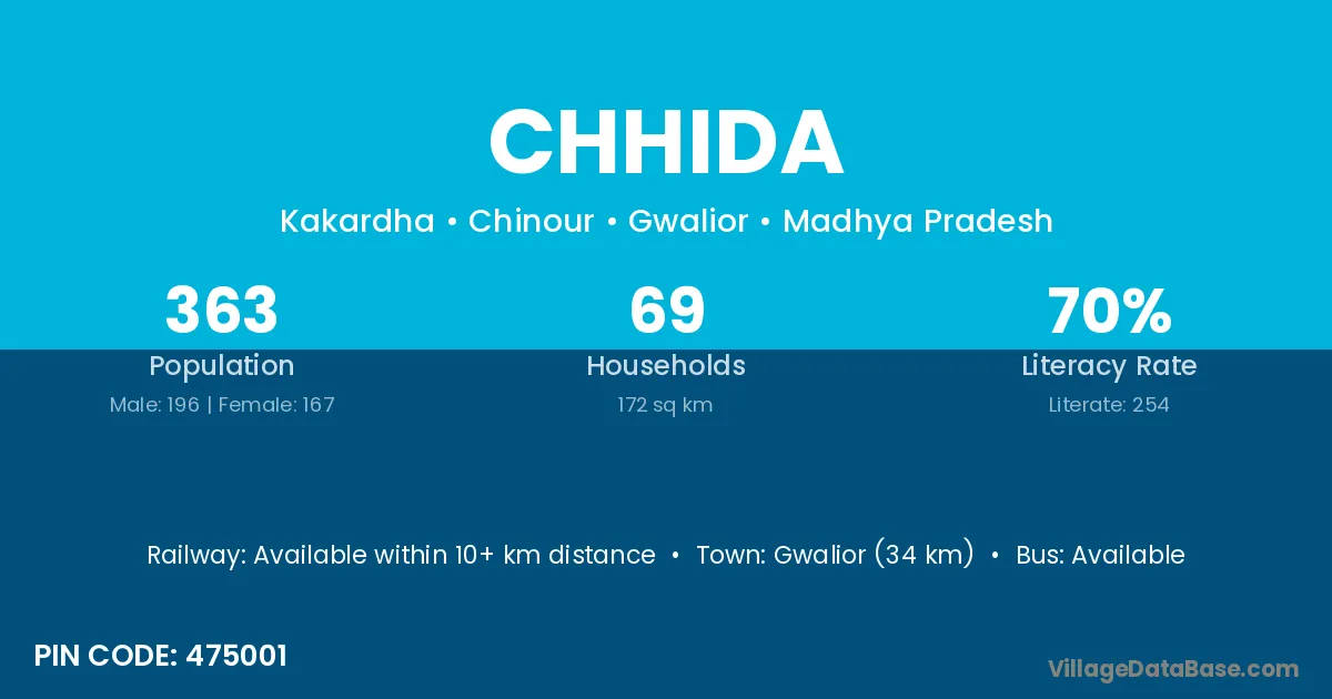Gwalior (34 km) is the nearest town to Chhida village for major economic activities and is located approximately 34 km away.