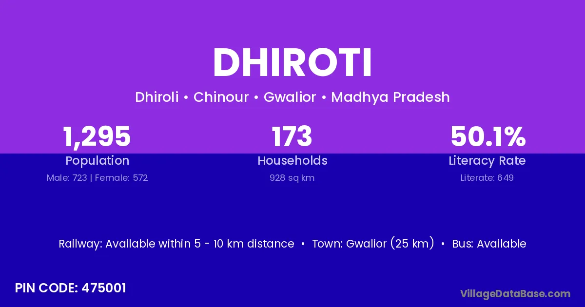 Gwalior (25 km) is the nearest town to Dhiroti village for major economic activities and is located approximately 25 km away.
