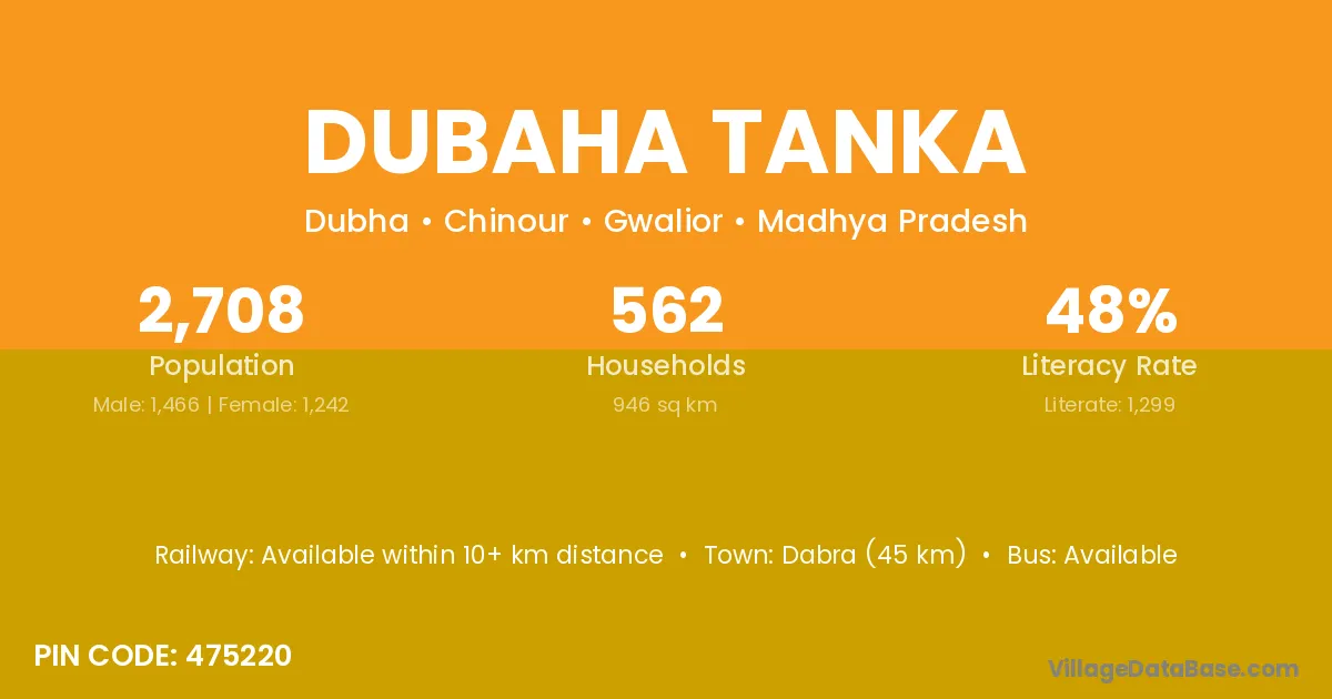 Dabra (45 km) is the nearest town to Dubaha Tanka village for major economic activities and is located approximately 45 km away.